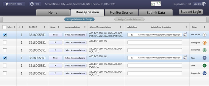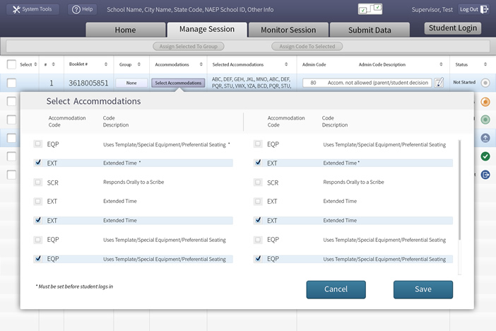 We also use redundant coding for information that needs to be processed quickly, such as the status indicators in the right-most column. Finally, we used a lower-contract color scheme that will reduce eye-strain on the administrators who use this system continuously throughout the testing day.